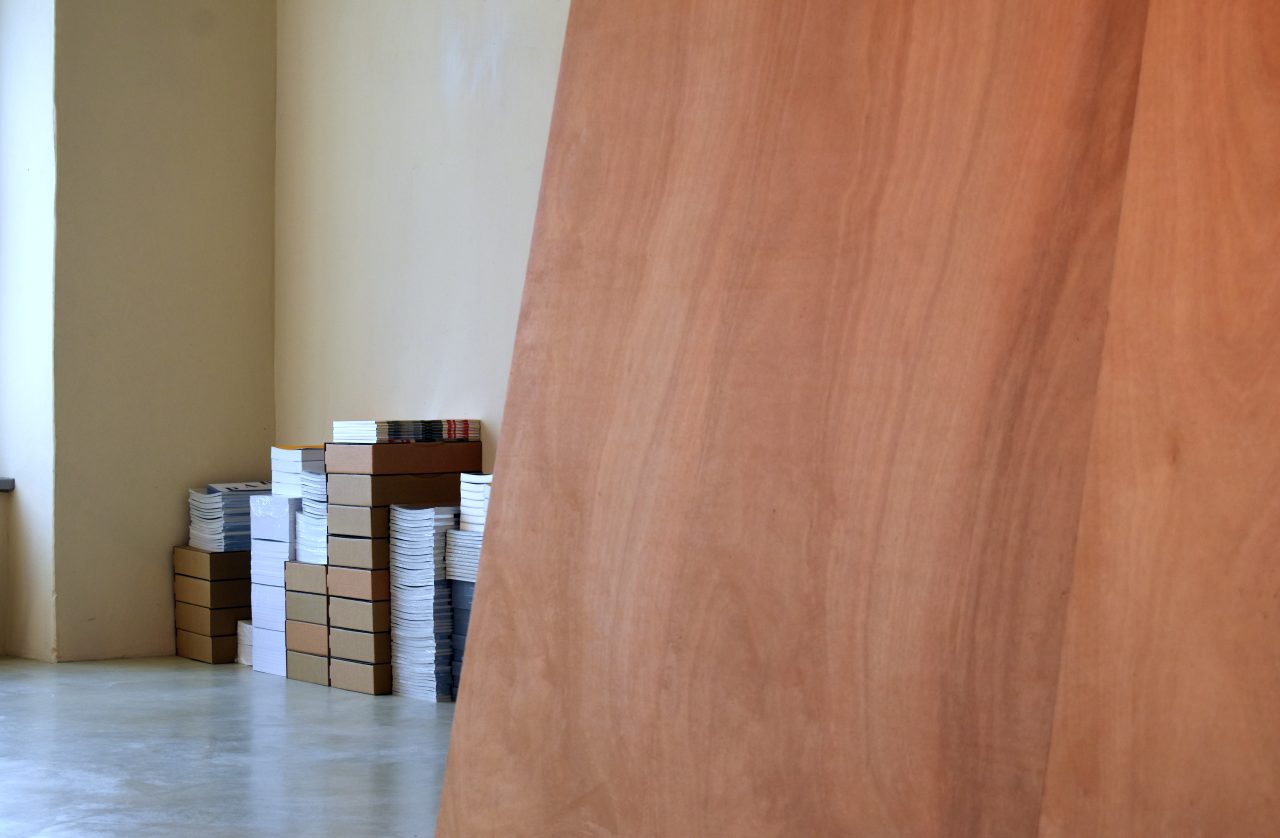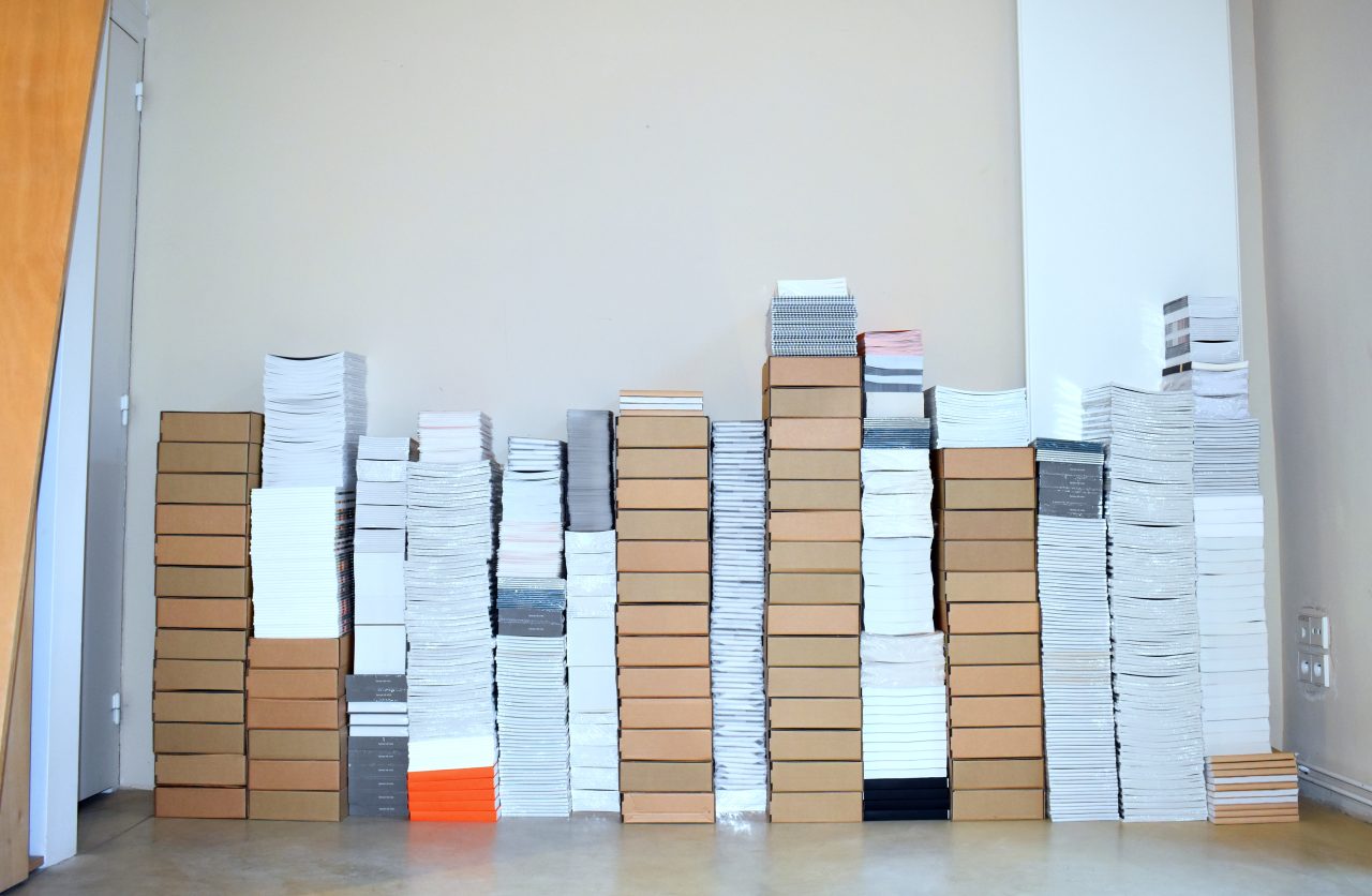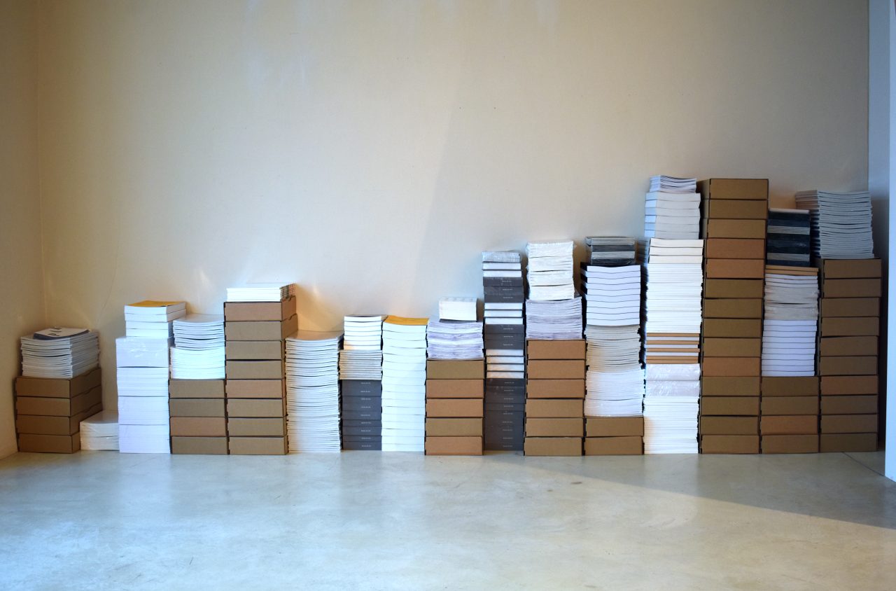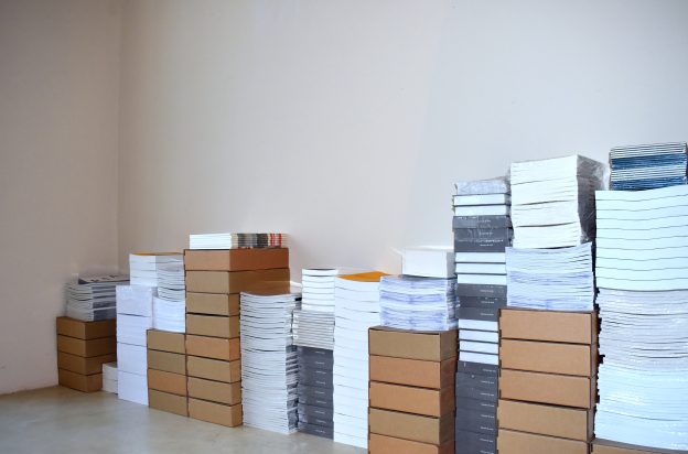 Le stock des éditions d’artistes publiées par le CDLA est présenté sous la forme d’une succession de piles de livres, dont les différentes hauteurs retracent l’histogramme des financements du centre d’art depuis sa création.