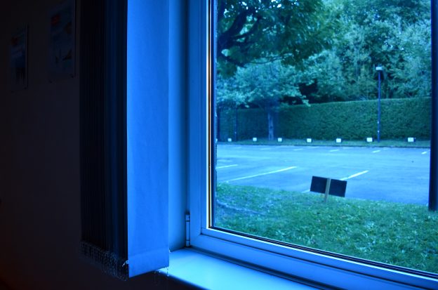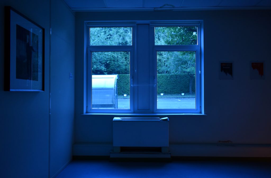 The project Altered State of Consciousness (Tax Evasion) [État modifié de conscience (l’évasion fiscale)] was conceived for the former tax center in Ottignies-Louvain-la-Neuve, which is now abandoned. According to the latest available data, the annual tax loss in Belgium due to tax evasion is estimated at €6.1 billion. This amount represents 9.17% of direct taxes. The present activation therefore consists of covering the windows of an entire room in this former tax center with a blue adhesive filter that allows only 9.17% of outside light to pass through.